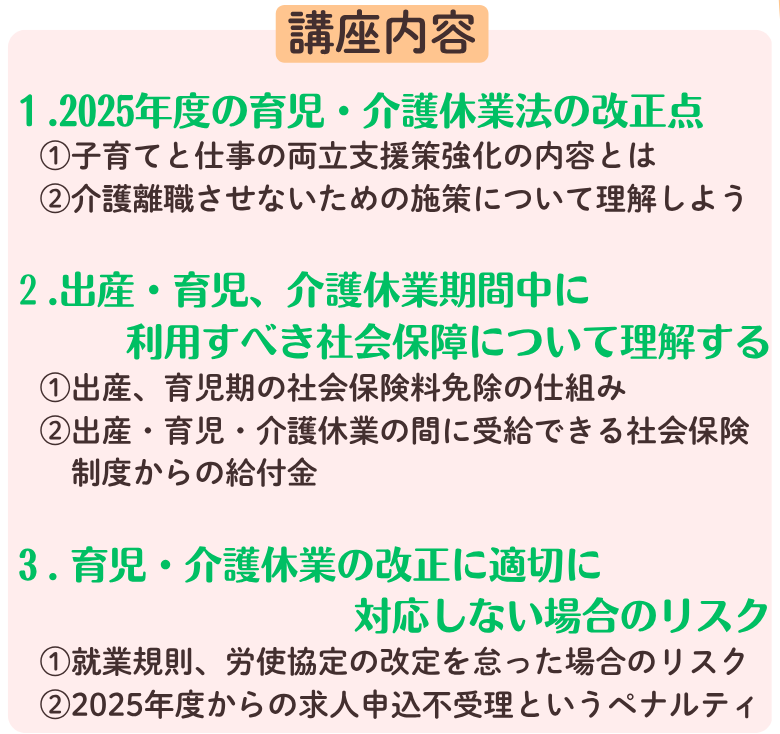 本セミナーでは育児介護休業法の改正点と会社の対応について点検し、必要な社会保険手続きの流れについて改めて解説していきます。