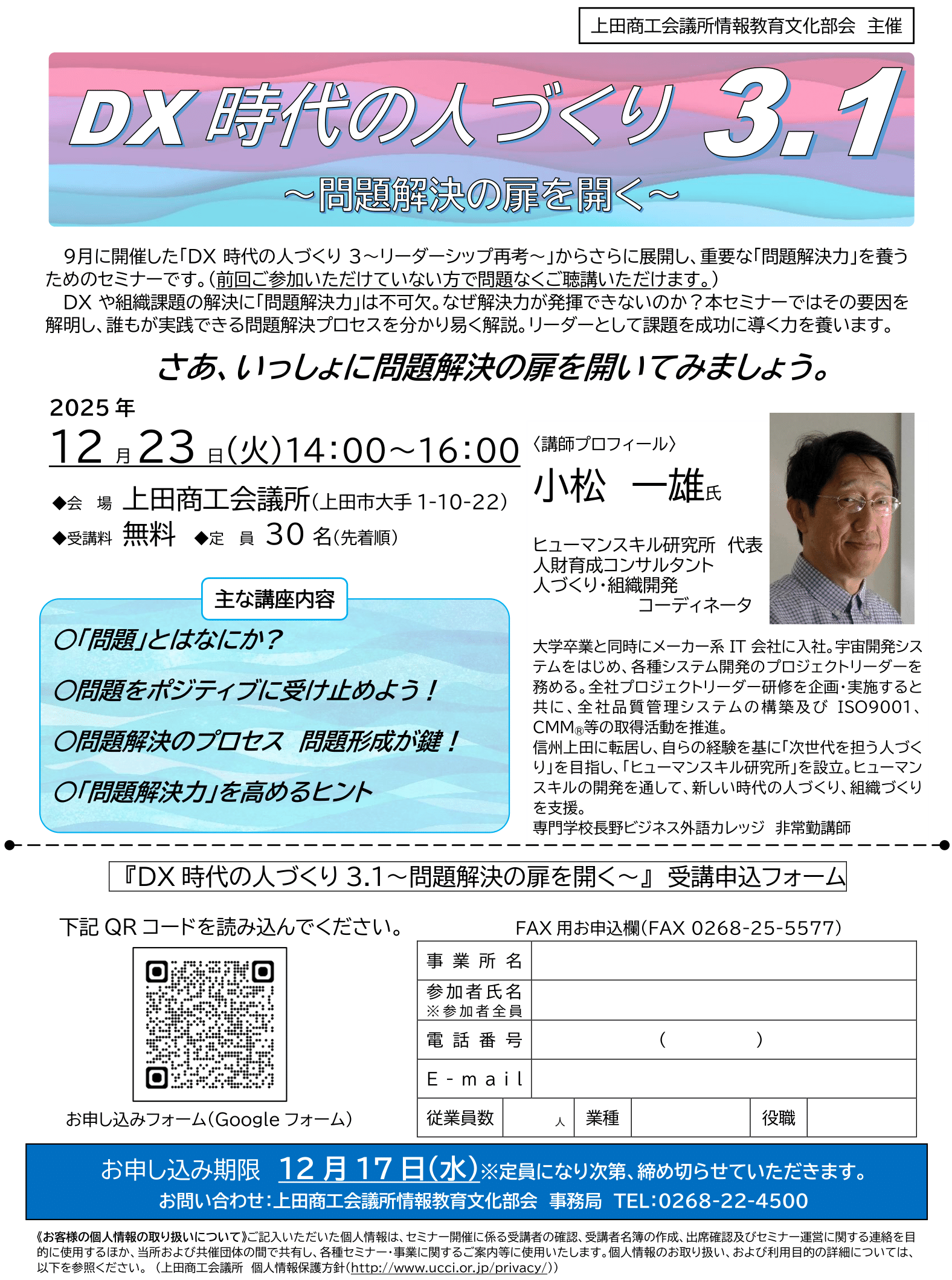 9月に開催した「DX時代の人づくり3~リーダーシップ再考~」からさらに展開し、重要な「問題解決力」を養うためのセミナーです。(前回ご参加いただけていない方でも問題なくご聴講いただけます。)
