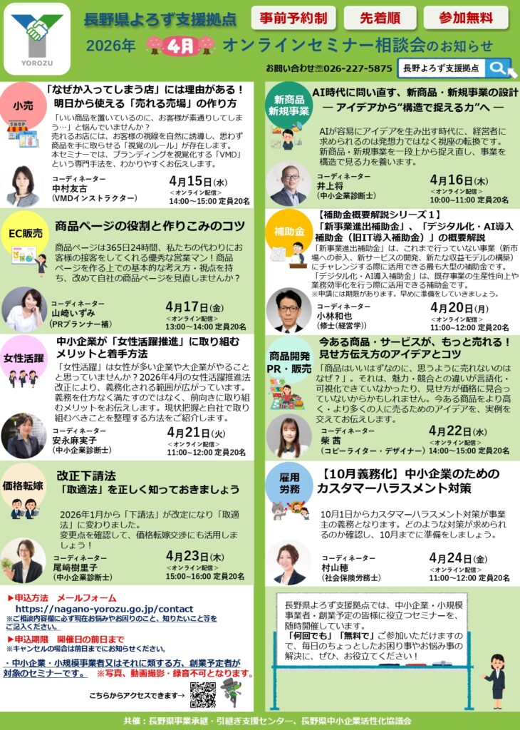 長野県よろず支援拠点 4月のオンラインセミナー・相談会